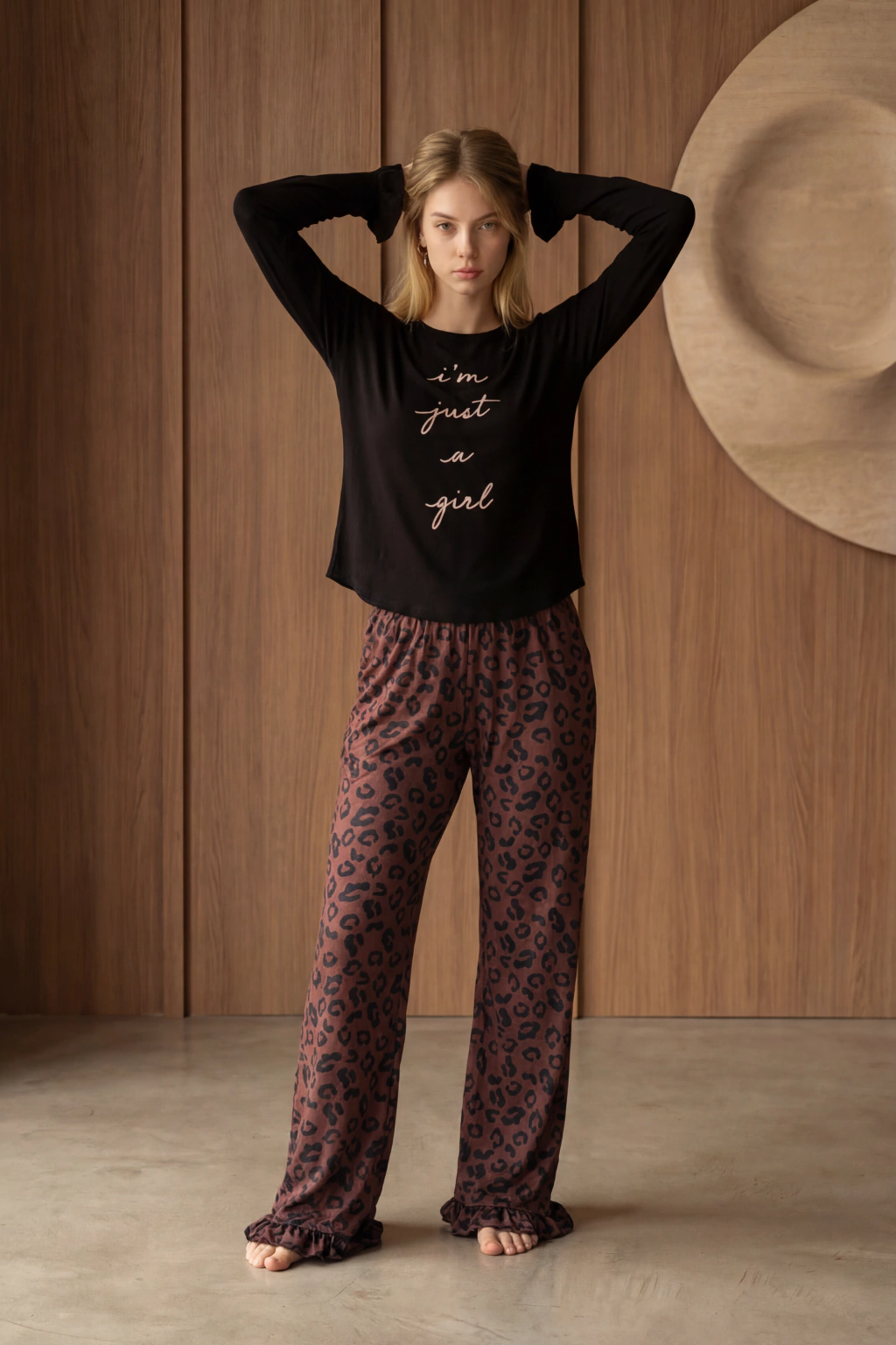 PIJAMA MANGA LARGA, CASACA MANGA RANGLAN CON ESTAMPA Y PANTALÓN WIDE LEG CON VOLADOS ANIMAL PRINT.