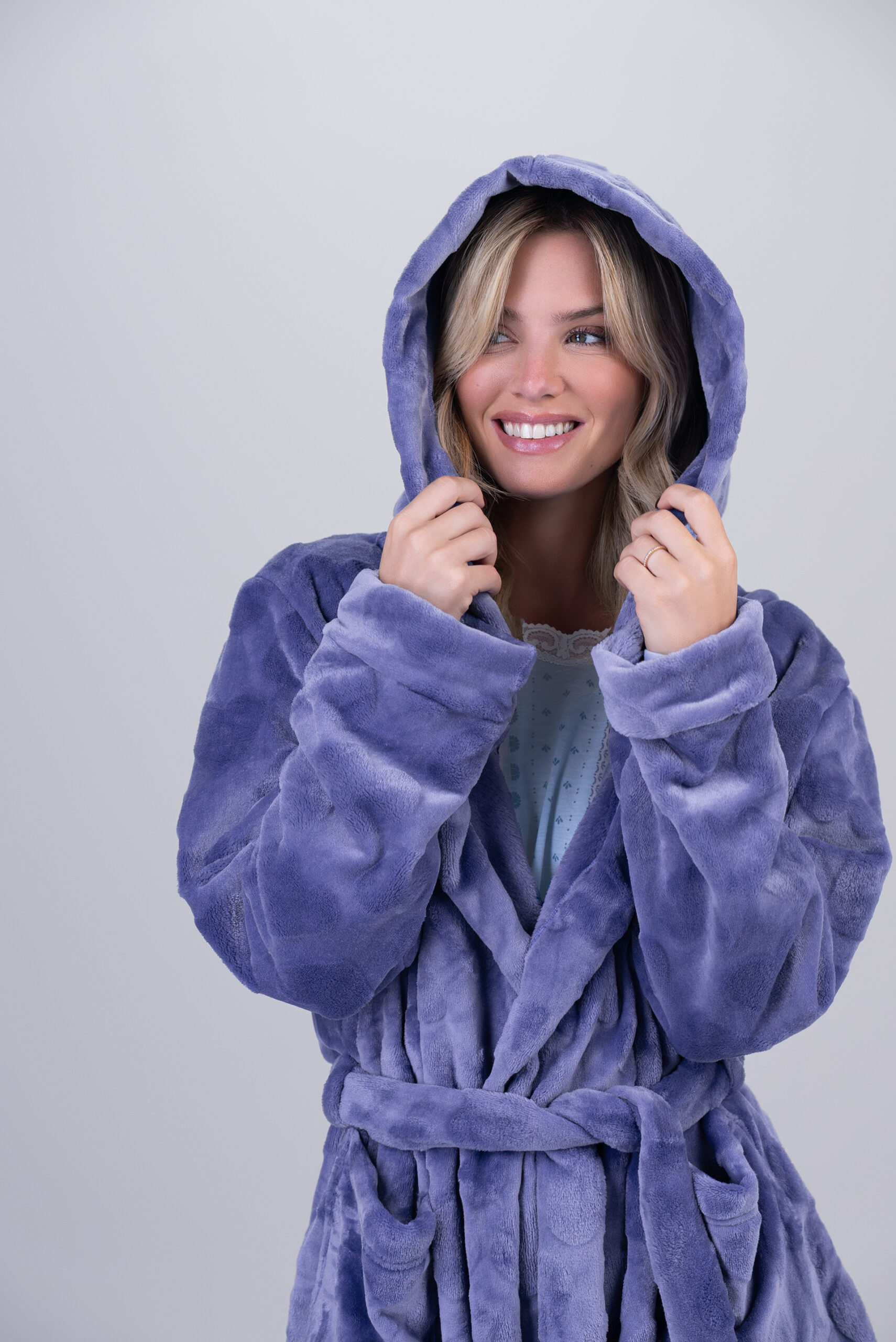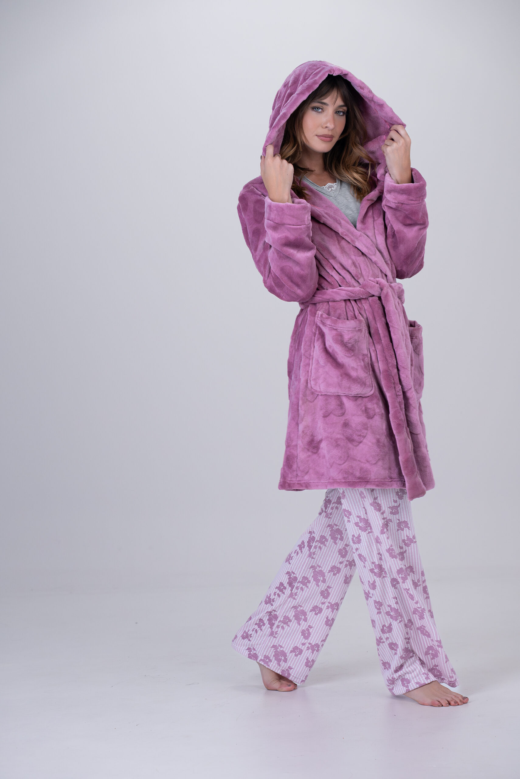Bata pelo largo suave con textura de corazones. Capucha amplia, lazos y bolsillos grandes. Mangas con puño.